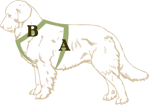 Aby odpowiednio dobrać szelki guard dla Twojego psa zmierz jego obwód w dwóch miejscach zaznaczonych na zdjęciu (A i B).